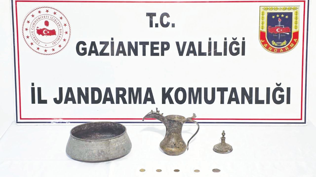 Gaziantep İl Jandarma Komutanlığı ekipleri, tarihi eser kaçakçılığının önlenmesine yönelik Gaziantep Cumhuriyet Başsavcılığı koordinesinde çalışma yaptı. Çalışma çerçevesinde, Nizip ve Şahinbey ilçelerinde icra edilen önleyici kolluk devriyesi esnasında define bulmak amacıyla izinsiz kazı yaptığı tespit edilen Ş.T., M.Ç., K.B., H.B. ve M.E. isimli şüpheliler suçta kullandıkları malzemeleri ile birlikte suçüstü yakalanarak gözaltına alındı. Yapılan aramada, 5 adet tarihi eser niteliğinde sikke, 1 adet tarihi eser niteliğinde kazan, 1 adet tarihi eser niteliğinde ibrik, 2 adet alan tarama anteni, 1 adet karot makinası, 3 adet karot makina ucu, 2,5 litre benzin ele geçirildi. Kazı malzemelerine el konularak şüpheli şahıslar hakkında yasal işlem başlatıldı.
