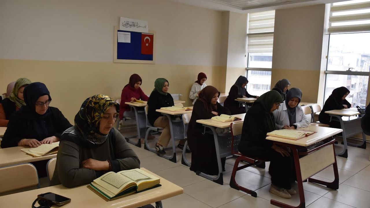 Kur'an-ı Kerim öğrenmenin mutluluğunu yaşayan ve kurs eğitmeninin yanı sıra kurstaki kadınların da destekleri ile her gün Kuran-ı Kerim öğrenmek için derslere katılan 72 yaşındaki Mukaddes Tiryaki, gösterdiği azim ve gayretle Kur'an-ı Kerim'i öğrenmenin yaşının olmadığını gösteriyor.