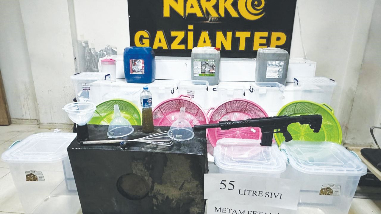 Gaziantep'te İl Emniyet Müdürlüğü Narkotik Suçlarla Mücadele Şube Müdürlüğü ekipleri ve Cumhuriyet Başsavcılığı koordinesinde uyuşturucu tacirlerine yönelik operasyon yapıldı. Operasyon çerçevesinde belirlenen bir adreste arama yapıldı. Hassas burunlu dedektör köpek destekli aramalar sonucunda 55 litre sıvı metamfetamin, 1 adet tüfek, 100 bin TL ve uyuşturucu imalatında kullanılan malzemeler ele geçirildi.