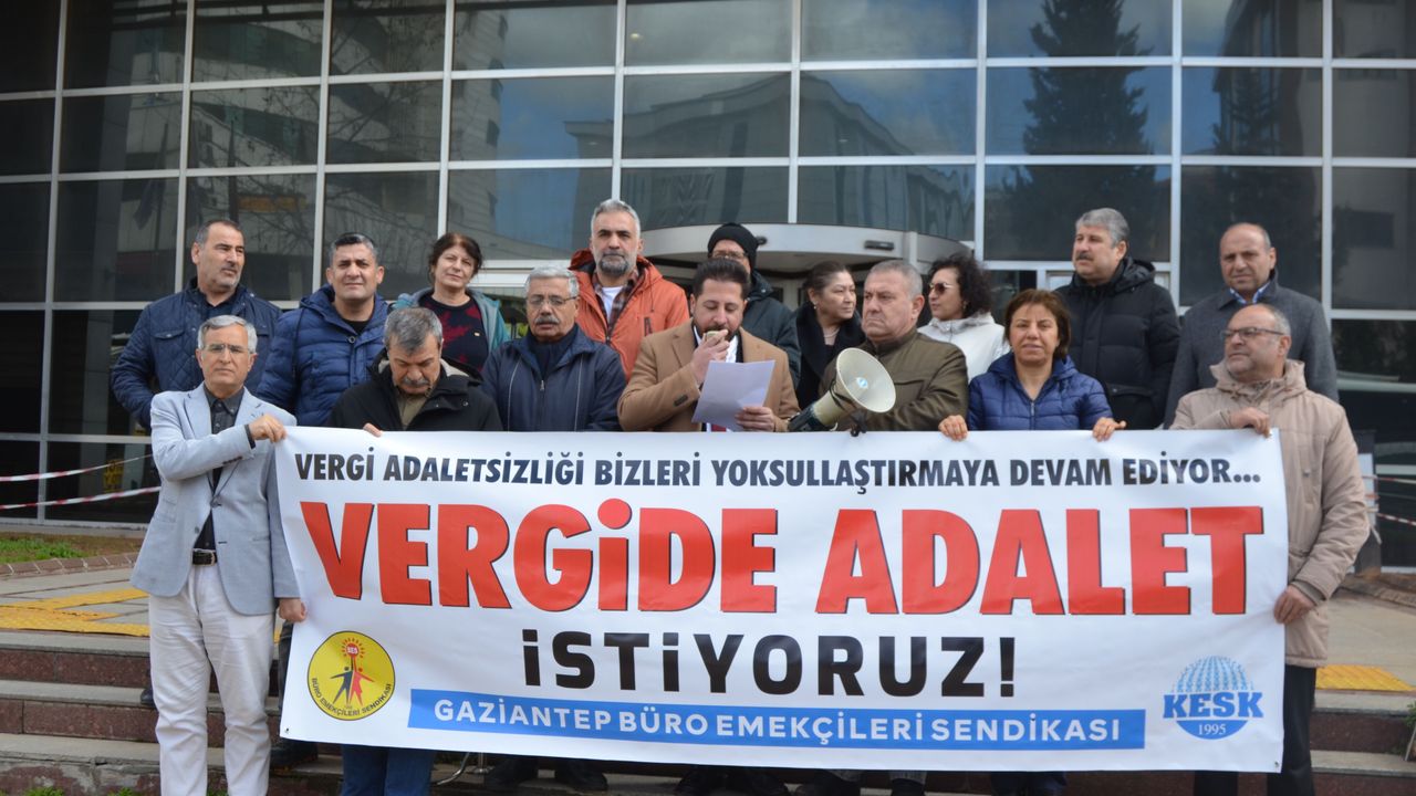 Vergi Haftası dolayısıyla Gaziantep Defterdarlığı önünde bir araya gelen Büro Emekçileri Sendikası Gaziantep Şubesi, yaptığı basın açıklamasıyla vergi de adalet çağrısında bulundu.