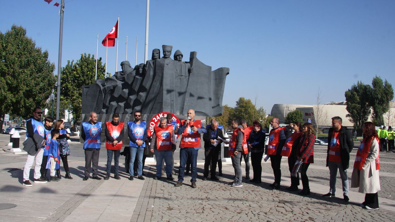 Eğitim İş Gaziantep Şube Başkanı Ali Arpat, konuşmasını şöyle devam ettirdi: ‘’Bir yıl boyunca emekçilerin çalışma ve yaşam şartlarını zora sokan resen atamalar, enflasyon karşısında eriyen ek ders ücretlerinin bir de zamanında ödenmemesi ya da kesilmeye çalışılması, öğretmenlerin liyakatsiz atamalar ile görev yerlerinin değiştirilmesi, atama bekleyen çok sayıda öğretmenin mülakat uygulaması nedeniyle mağdur edilmesi yaşanan sorunların sadece birkaçıdır. Yapılan bu haksızlıkların üstüne bir de sorunlara karşı ses çıkarmak isteyen eğitim ve bilim emekçileri tehdit, sürgün ve disiplin gibi cezalarla susturulmak istenmiştir.’’
