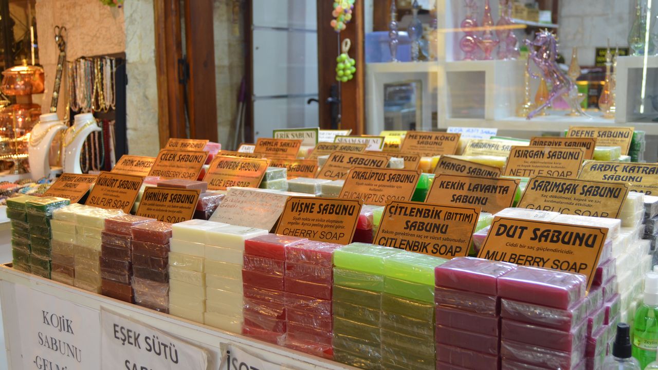 Bedesten Çarşısı’nda faaliyet gösteren Göznuru Dünyası’nda sergilenen birbirinden renkli sabunlar göz kamaştırıyor. Egzamadan ayak mantarına, sedeften lekeye, kaşıntıdan alerjiye kadar birçok hastalıkta kullanılan 80 çeşit sabun bulunuyor.