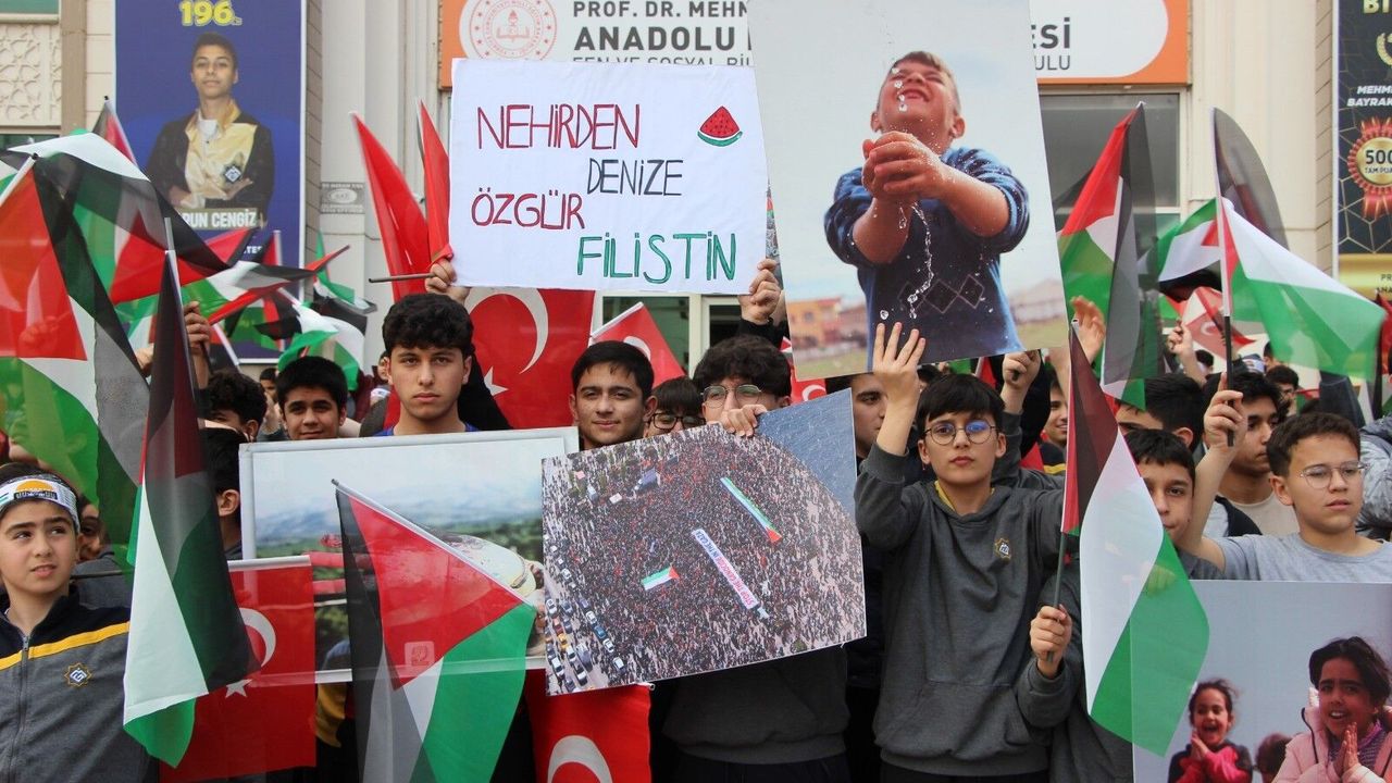 İşgalci İsrail'in "olağanüstü hal" ve İran'a yönelik savaştan kaynaklanan güvenlik şartları bahanesiyle Mescid-i Aksa'yı ibadete kapatmasına da tepki gösteren Arslan, "Bununla beraber ilk kıblemiz Mescid-i Aksa, 850 yıldır ilk defa ibadete kapatıldı. İnsanlık haklarından hiçbirine saygısı olmayan Siyonist devlet, insanların ibadet haklarına da müdahale etti. Bunlar bu cesareti ellerindeki güç ve silahla beraber 2 milyar Müslüman aleminin sessizliğinden almaktadır. Bu konuda İslam dünyasının liderlerinden ortak ve etkili bir irade bekliyoruz. Mescid-i Aksa'nın kapanmasıyla tüm mabetlerimize gölge düşmüş, mabedimize namahrem eli değmiştir. Biz Müslüman gençler olarak buradan haykırıyoruz. Mescid-i Aksa bir gün mutlaka özgürleşecektir. Mescid-i Aksa'nın kutsallığına gölge düşüren her namahrem el kırılacak ve bunun hesabı mutlaka sorulacaktır. Filistin halkı da Mescid-i Aksa da yalnız değildir. Zulme karşı susmayacağız. Geri adım atmayacağız, insanlık onuru için sesimizi yükseltmeye devam edeceğiz. Buradan vicdan sahibi herkesi bu zulmü haykırmaya ve protesto etmeye davet ediyoruz. Gülşen Batar Anadolu Lisesi gençliğine çağrıda bulunuyoruz; bu konuda bizimle misiniz? ‘Zalimler için yaşasın cehennem' diyor ve Gazze'nin zindanlarında şehadeti bekleyen yiğitlere selamlarımızı ve dualarımızı gönderiyoruz" diye konuştu.