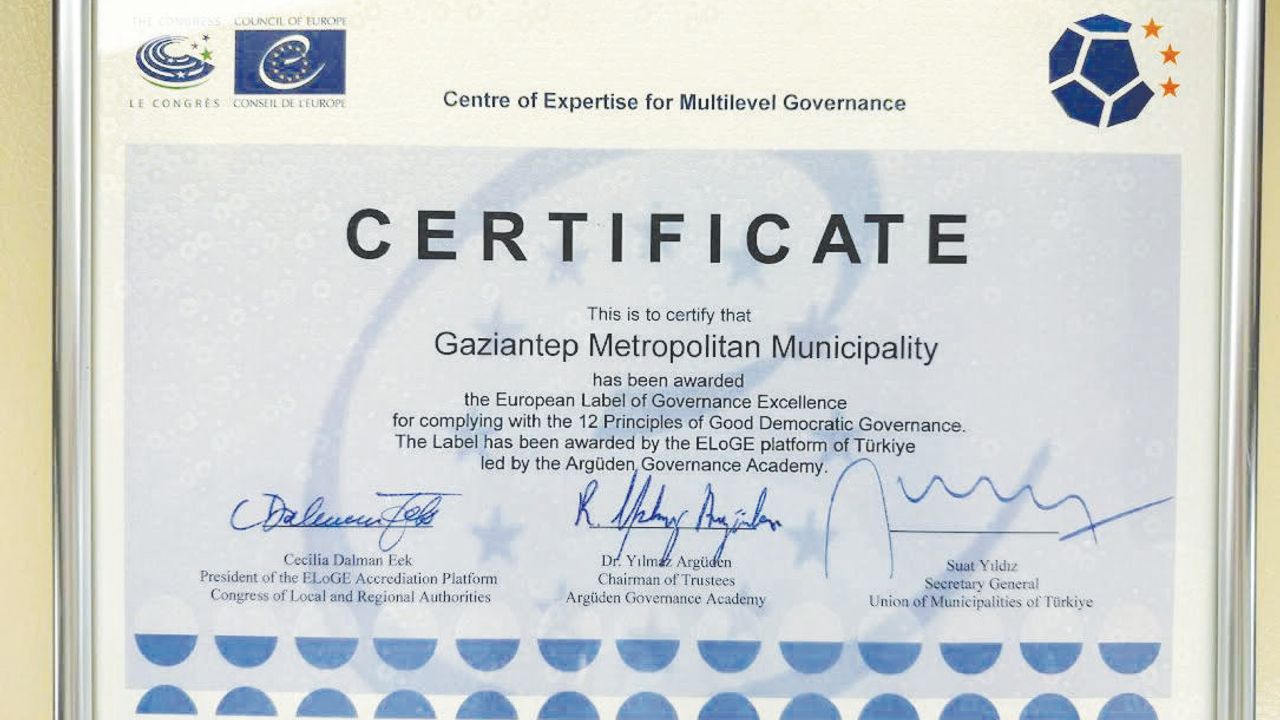 Büyükşehir Belediyesi, 12 ilke ve 97 kriter çerçevesinde gerçekleştirilen kapsamlı değerlendirme sonucunda Avrupa Konseyi tarafından verilen Avrupa Yönetişim Mükemmelliği Markası (ELoGE) ödülüne layık görüldü. Ödül, Gaziantep Büyükşehir Belediyesi Başkan Vekili Abdulkadir Sökücü tarafından teslim alındı.
