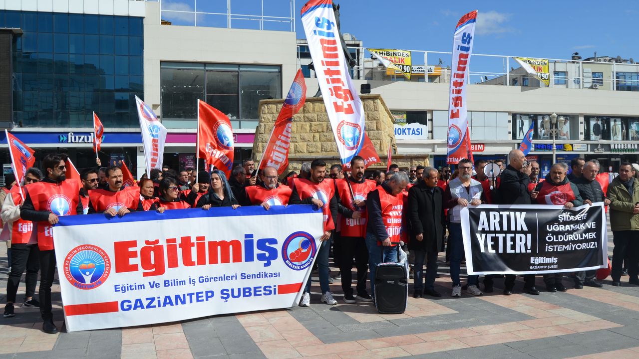 Bu ülkede öğretmenlerin canından endişe ederek okula gitmek istemediklerini sözlerine ekleyen Eğitim İş Gaziantep Şube Başkanı Ali Arpat, konuşmasını şu şekilde sürdürdü: ‘’Biz can korkusuyla çalışmak istemiyoruz. Can güvenliğimizin olmadığı bir eğitim sistemini kabul etmiyoruz. Artık yeter. Kaybettiğimiz meslektaşımıza rahmet, ailesine ve öğrencilerine sabır diliyoruz. Yaralılarımıza acil şifalar diliyoruz. Buradan bir kez daha ilan ediyoruz; öğrencilerimizin ve eğitim emekçilerinin can güvenliği sağlanıncaya kadar susmayacağız, mücadele edeceğiz. Çünkü bir ülkenin geleceği, öğretmenine verdiği değerle ölçülür.’’