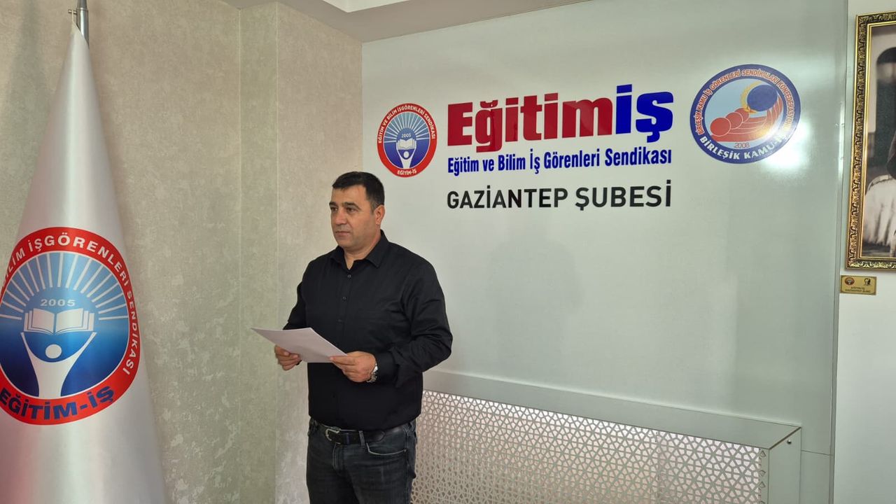 Basın açıklamasını okuyan Eğitim İş Gaziantep Şubesi Mali Ahmet Tutar, ‘’Eğitim çalışanlarının ve emeklilerinin hak ettiği insanca yaşam koşullarına kavuşması, ücret adaletsizliğinin giderilmesi ve mesleki itibarın korunması amacıyla acil yasal ve idari düzenlemelerin hayata geçirilmesi hususunda gereğini talep etmekteyiz’’ dedi.