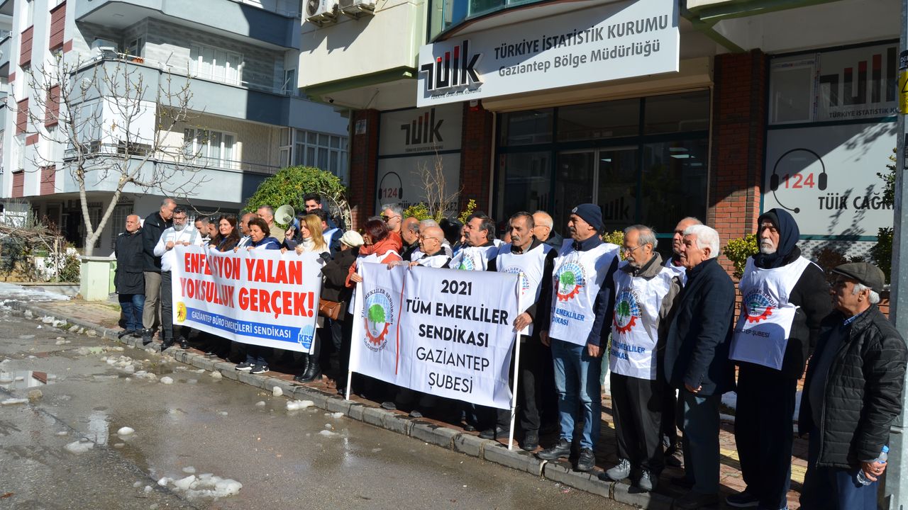Maaşlara yapılan zam oranlarına tepki gösteren kamu emekçileri ile emekliler, bir kez daha sahaya indi. Büro Emekçileri Sendikası Gaziantep Şubesi’nin Türkiye İstatistik Kurumu Gaziantep Bölge Müdürlüğü önünde basın açıklamasına Tüm Emeklilerin Sendikası Gaziantep Şubesi’de destek verdi.